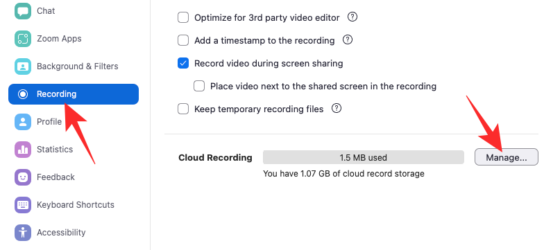 On the left, click on the ‘Recording’ tab. Then click on ‘Manage’ under ‘Cloud Recording.’