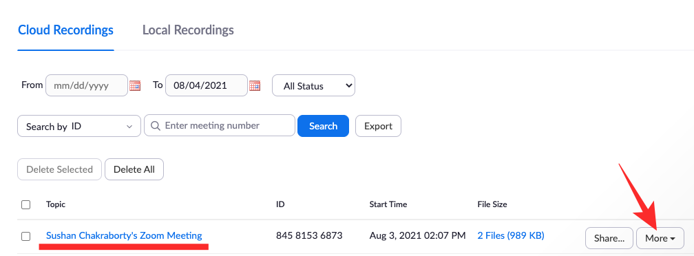 Now, click on the ‘More’ button on the right-hand side of the recording.