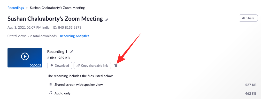 Now, click on the recycle bin icon on the right of the ‘Copy Shareable Link’ button to delete individual recordings.