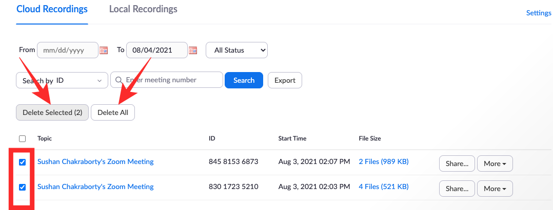 Finally, you could also select multiple recordings by selecting them and clicking either the ‘Delete Selected (number of selections)’ or the ‘Delete All’ button.