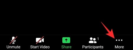 As you may already know, the Zoom mobile client doesn’t allow local recording. So, pushing the recording to the cloud is the only valid option here. To record on a mobile device, first, launch the Zoom client on your Android or iOS-powered mobile and either join or start a meeting. Now, tap on the ‘More’ button at the bottom-right corner of your screen.