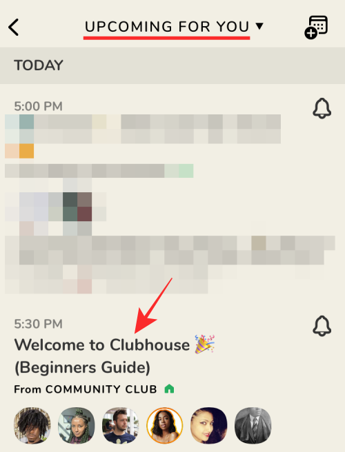 The ‘Upcoming For You’ screen is accessible by tapping the ‘Calender’ icon at the top of your Clubhouse feed.