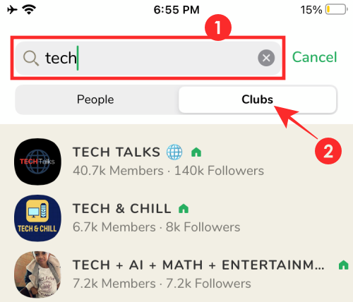 To join a club on Clubhouse, search for a club by tapping on the search icon from the app’s lobby and then typing the name of the club or a topic of interest that you may be into.