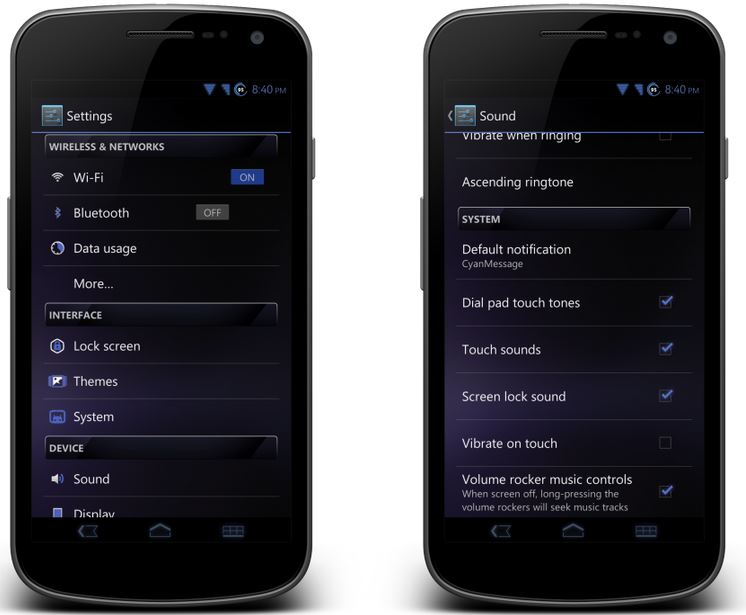 NOTE: The theme needs to be flashed from recovery and is tested with the AndroidME CM10 ROM, but should work well with other CM10 based ROMs for the Galaxy Nexus, though it is best to make a backup before trying the theme out on any other ROM than AndroidME.