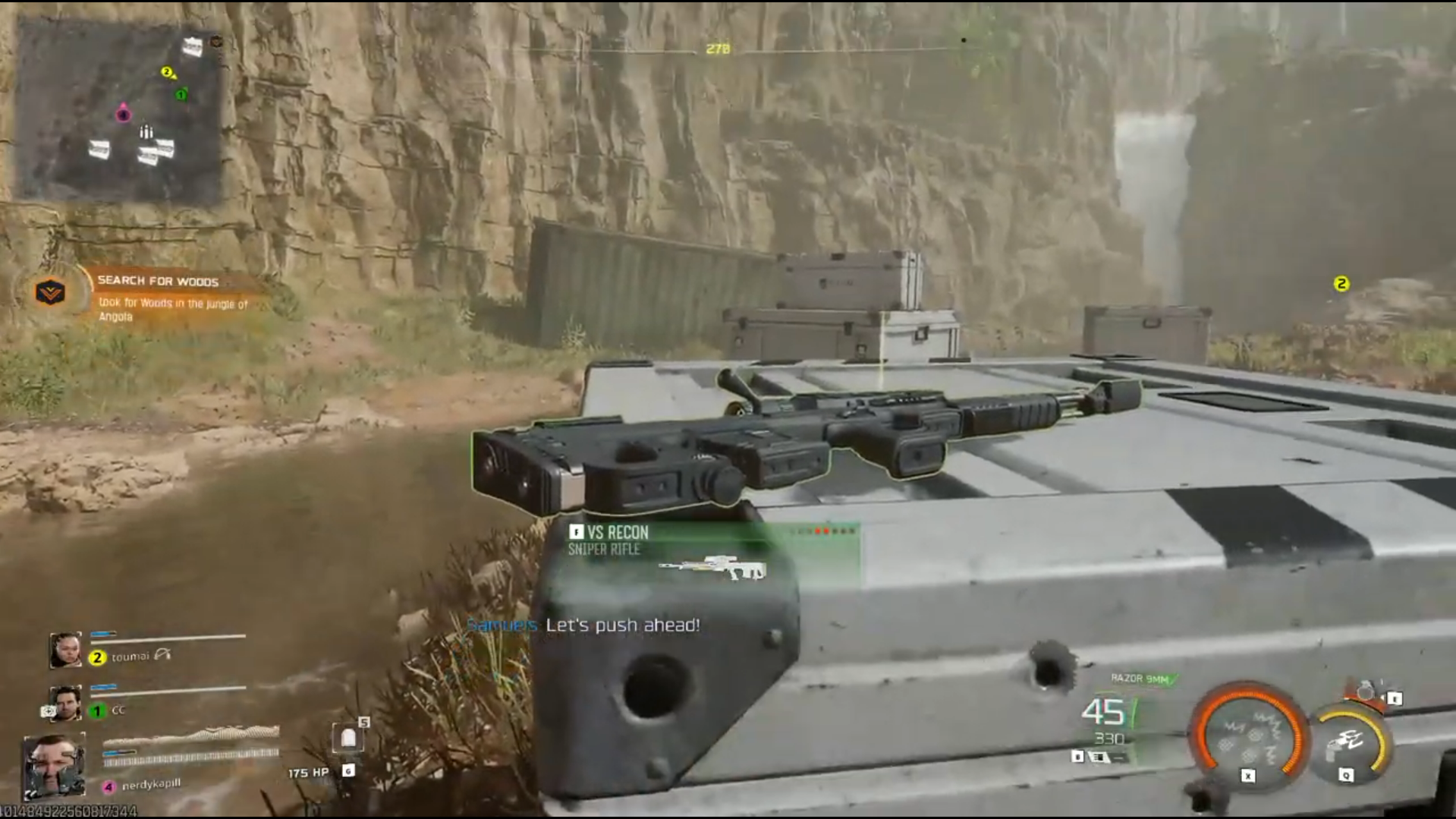 Clear the area of the guild forces once the enemies have been cleared you can pick up the VS Recon sniper rifle which can be found on top of one of the large white crates towards the left of the area right next to the small water stream.