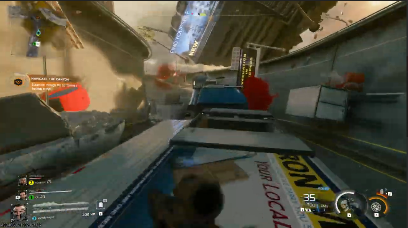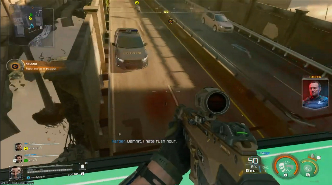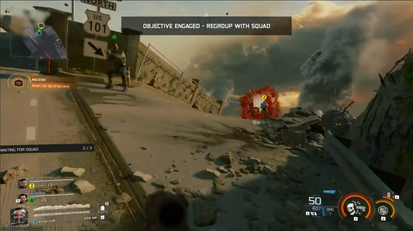 The mission will start in a post apocalyptic Los Angeles highway. Your first objective will be to follow the drone. Head straight ahead on the ruined highway and clear any enemies that you encounter, the highway is bottom -less and you will have to jump over some floating vehicles and containers on your way ahead. Time your jumps and make sure you don't fall down.