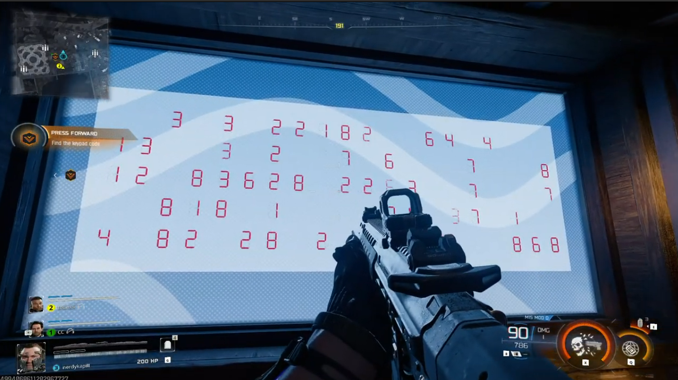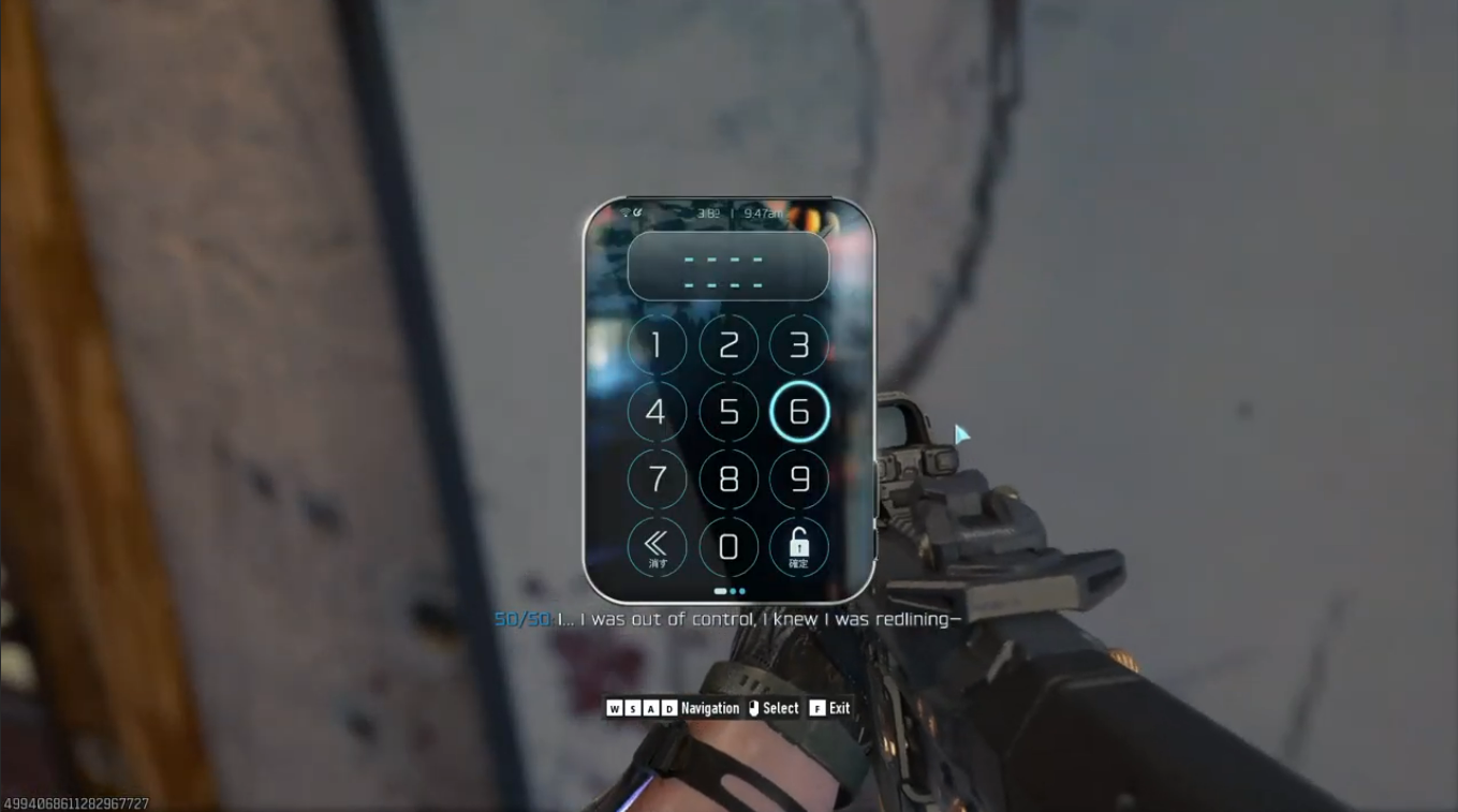 To solve the keypad puzzle; hack into the terminal opposite the sliding door in the room. Keep rotating the moving panels to connect the power from one end to the other. Meanwhile, 50/50 will give you the first two digits of the keypad code. She does not remember the rest, but she will repeat the first two digits twice, which is a clue. Head to the lobby to find a large screen with random scrambled numbers appearing on it. Look for the number that matches the initial hint given by 50/50. It should be static and shouldn't be fluttering like the rest of the numbers.