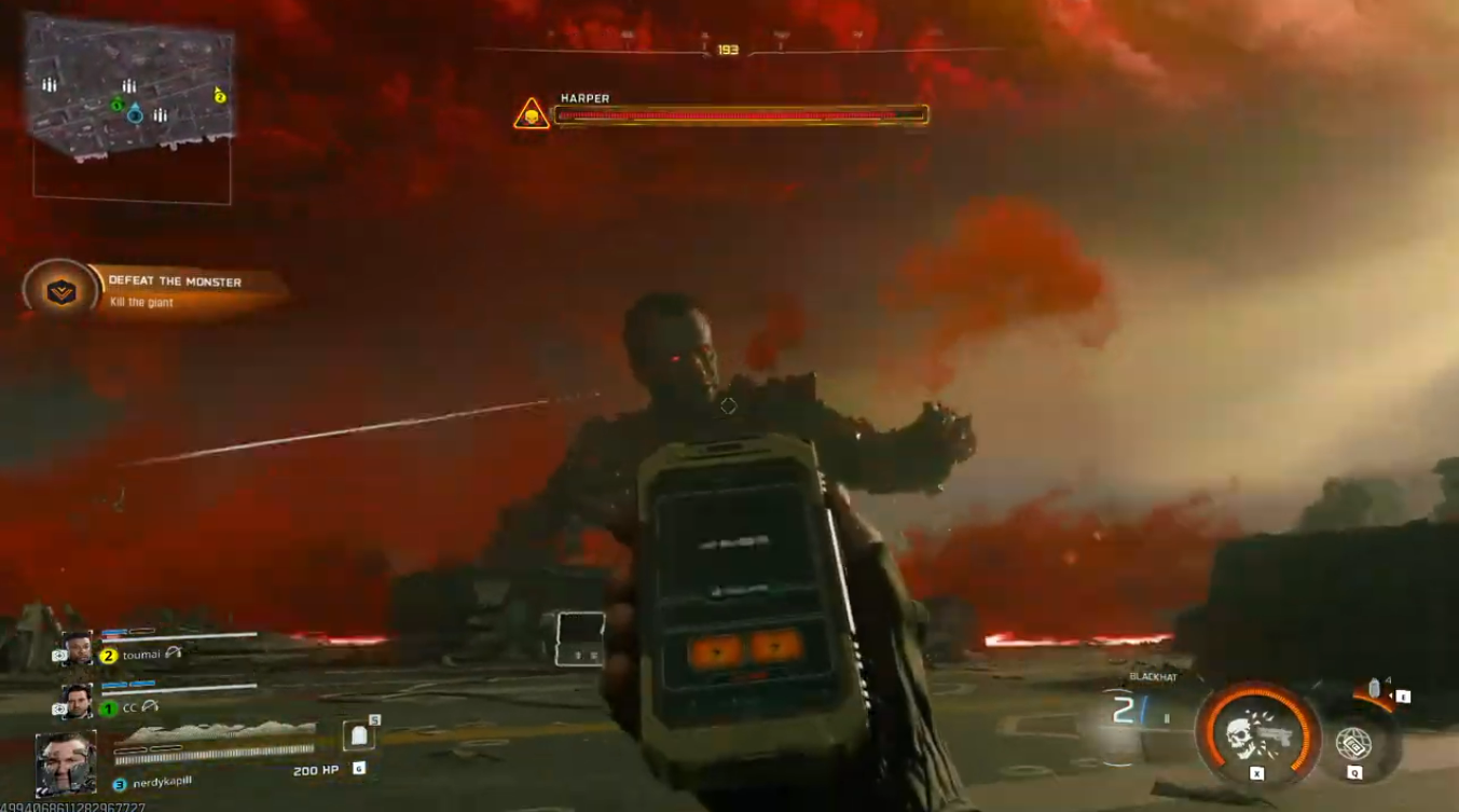 The boss has many attacks it will try to kill you by smashing you with its hands or spray poisonous gas from its mouth. The boss will also create mini-harpers and vanish, kill all the mini version and the boss will return. Repeat this process everytime the boss spawns mini enemies and disappears. Explosives and projectile launchers like RPG and Grenade Launchers will be very useful against this boss as they cause considerably more damage than the assault rifles so keep an eye out for those. Once the boss health is halfway down it will develop new attacks like firebombing specific areas in the map that are marked by circular crosshair like markers on the ground. Stay clear of such areas. Once the boss is eliminated a cutscene will trigger which will mark the conclusion of this mission. The mission ends with the real Harper showing up.