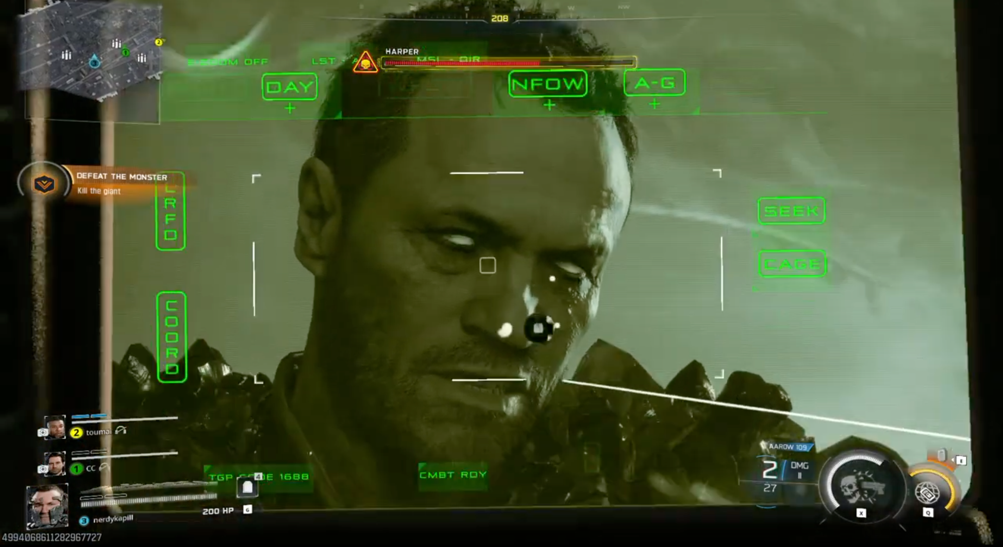 Harper enters the Command City of the US during the Fracture mission. Once inside, something transmits through the city’s core systems and transforms him into the strongest enemy in that zone. His body enlarges, his behavior becomes violent, and he attacks you with shockwaves, mouth-bombs, and gas that heals him. The fight becomes a full survival battle as he switches between giant and human forms.