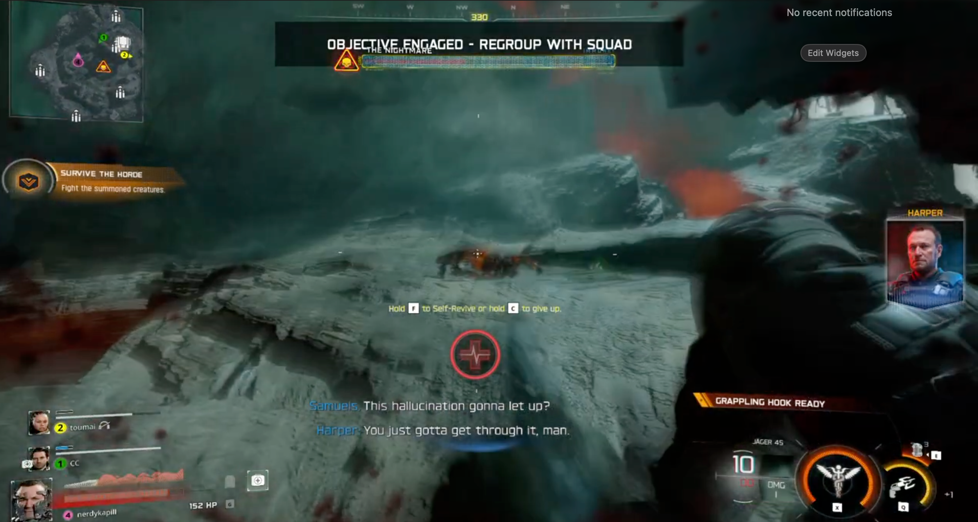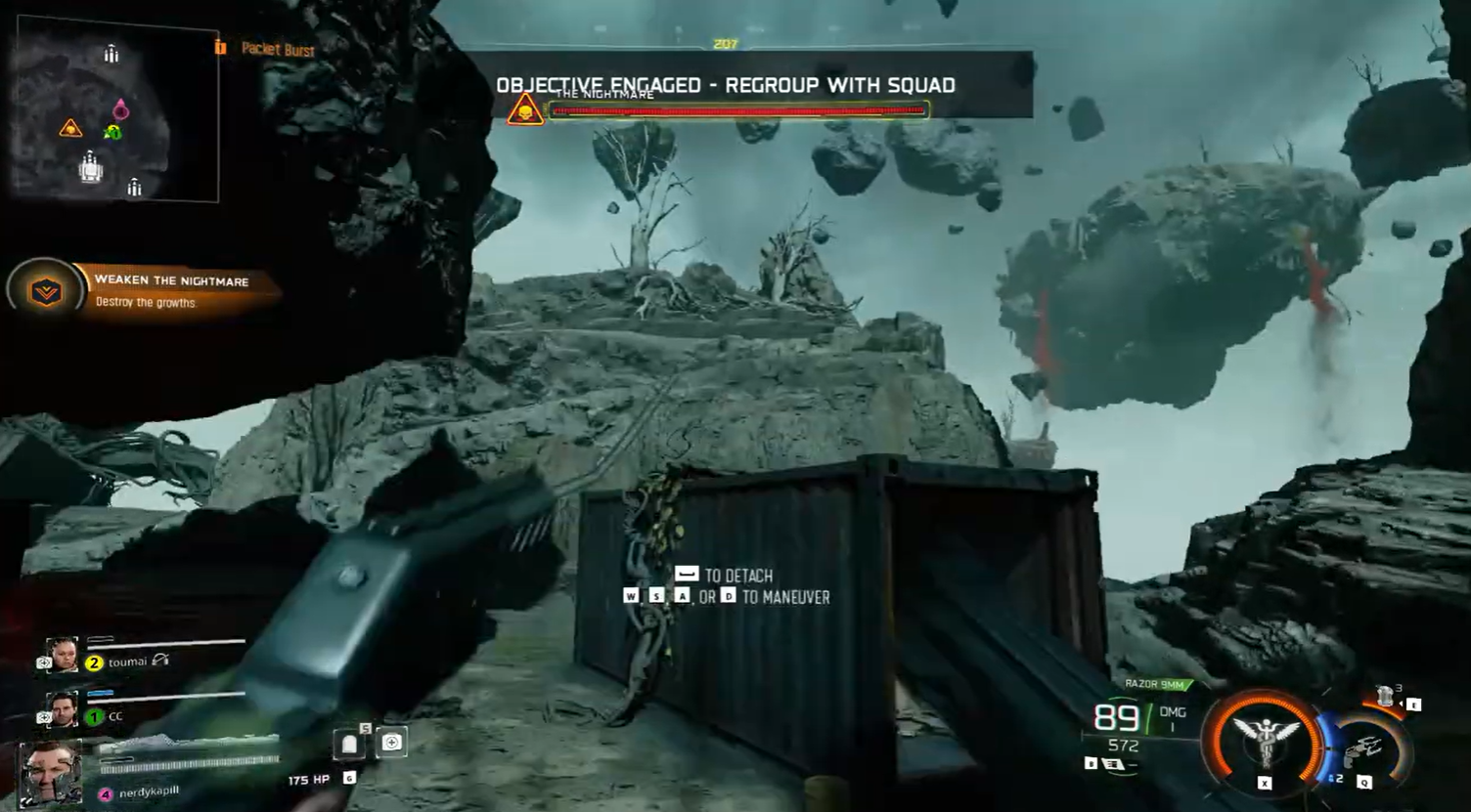 Use the Grappling Hook to escape the chaos, get to higher ground, and attack the Nightmare boss from a better position and escape the AOV attacks