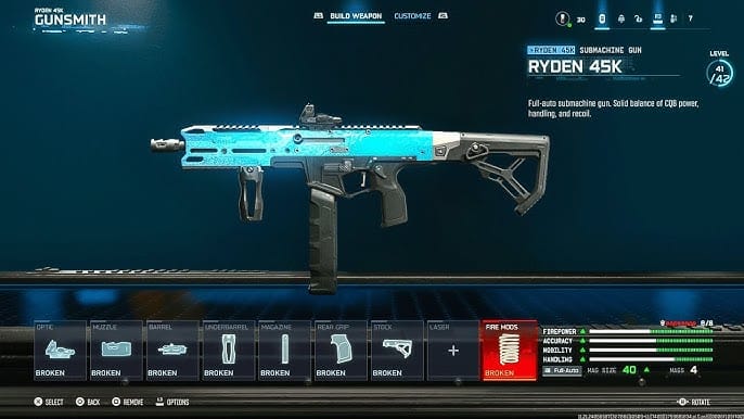 The Ryden 45K is a compact submachine gun known for its ultra-high fire rate, quick sprint-out speed, and excellent hip-fire accuracy. It excels in tight maps where fast reaction time and aggressive movement matter most.