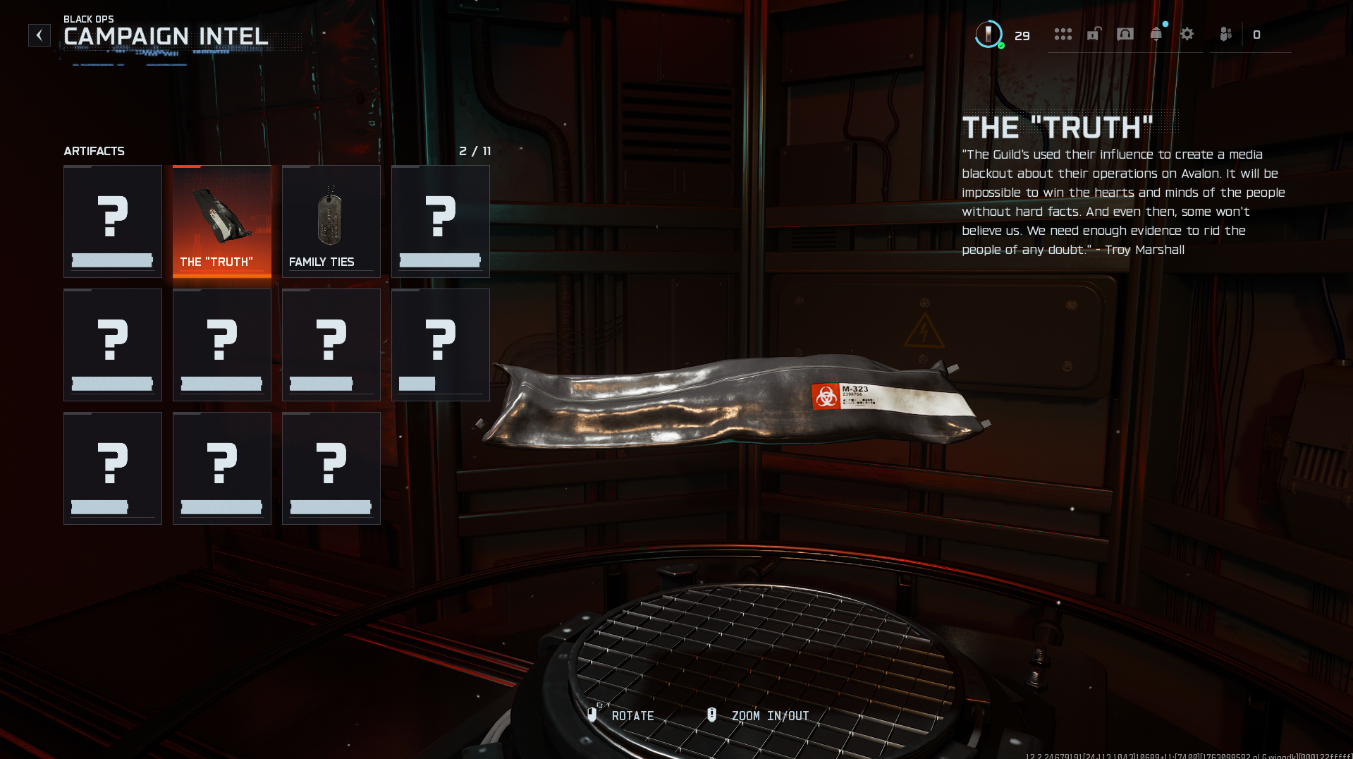 Explore Avalon, seeking Karma's location in her grotto. Before interacting with Karma, check to her right for a body bag containing this intel piece.