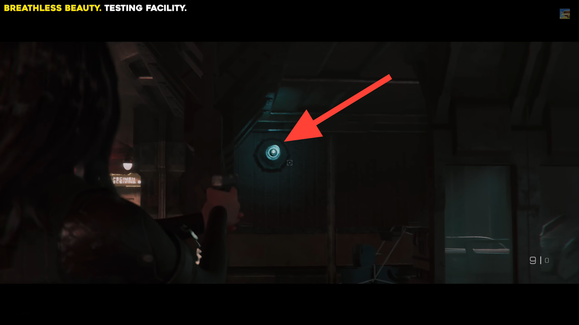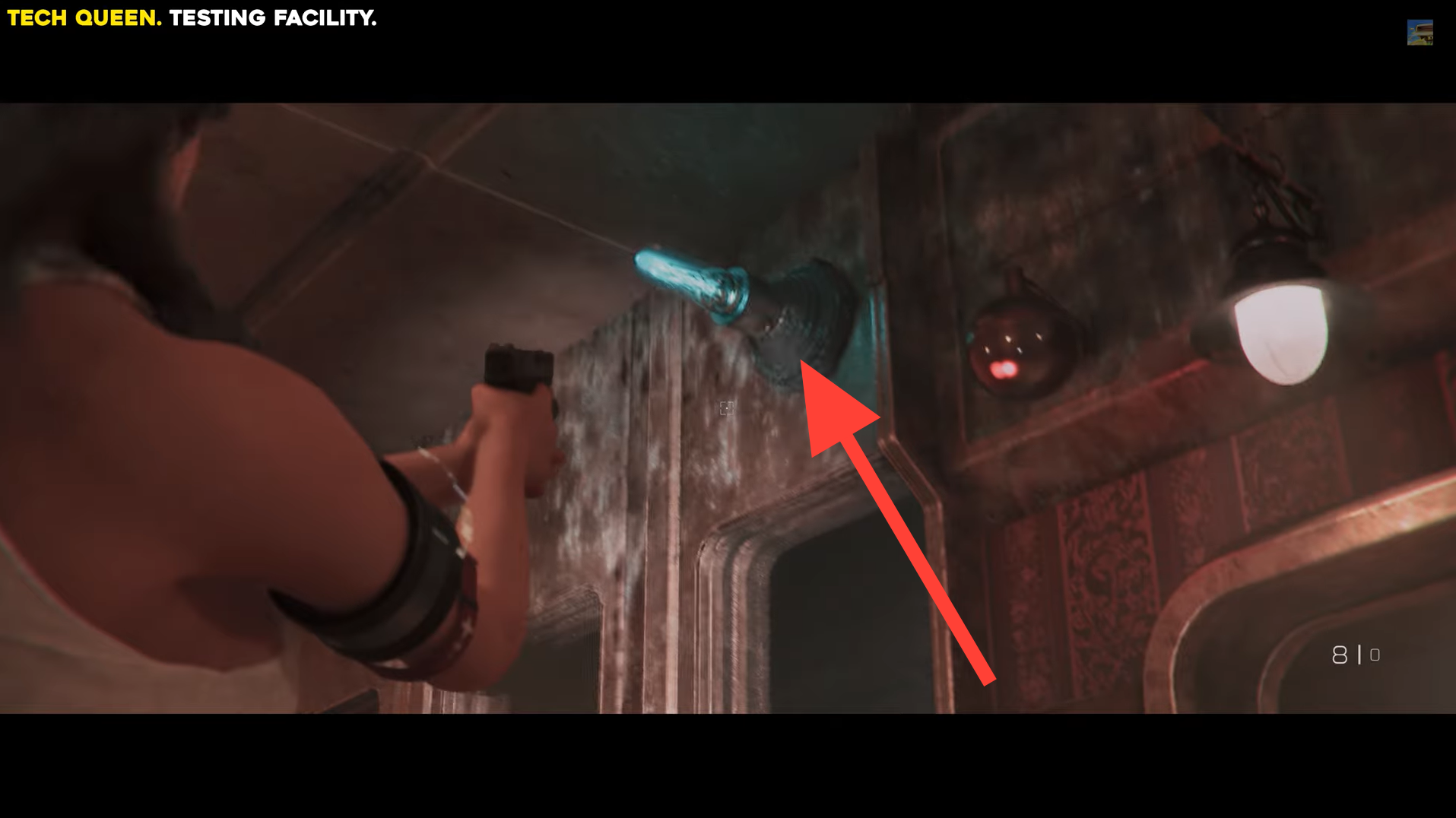 Head to the Security Room inside the Testing Facility, move to the east side, and shoot the bright white bulb on the door’s top-left to unlock the path.