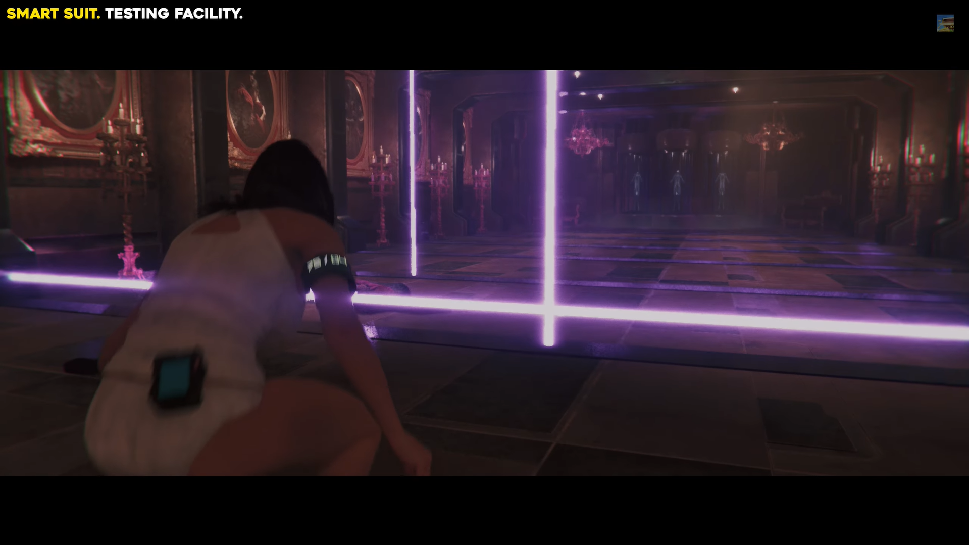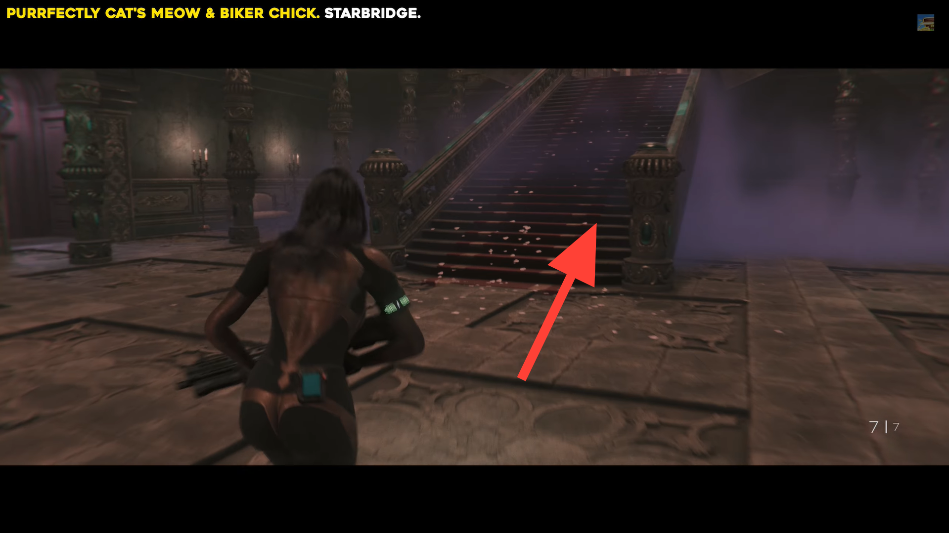Turn right twice, down the stairs, then through the doorway into the fixed-camera area. Image credits: TeamKill Media / YouTube: 100% Guides
