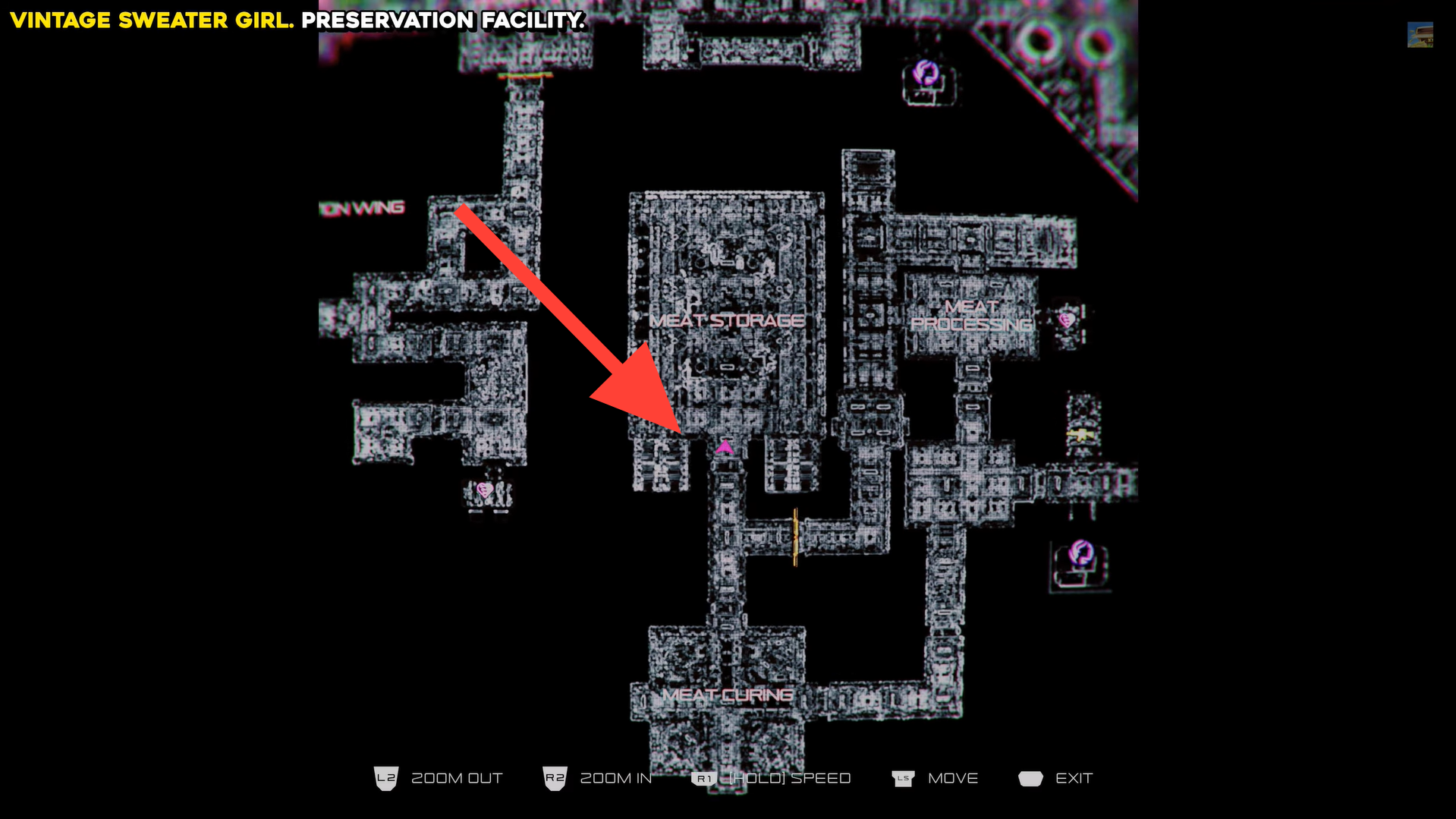 In Meat Curing, walk forward and turn left into Meat Processing, then follow the straight path to the fixed-camera area to grab the outfit.