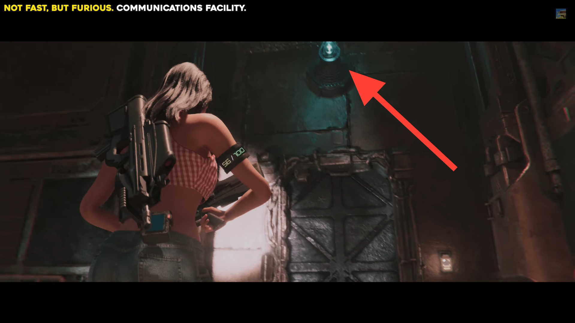 Head to the far end of the Cinderline Power Room in the Communication Facility, shoot the white bulb above the door, then go through the door beneath the broken light and continue straight.