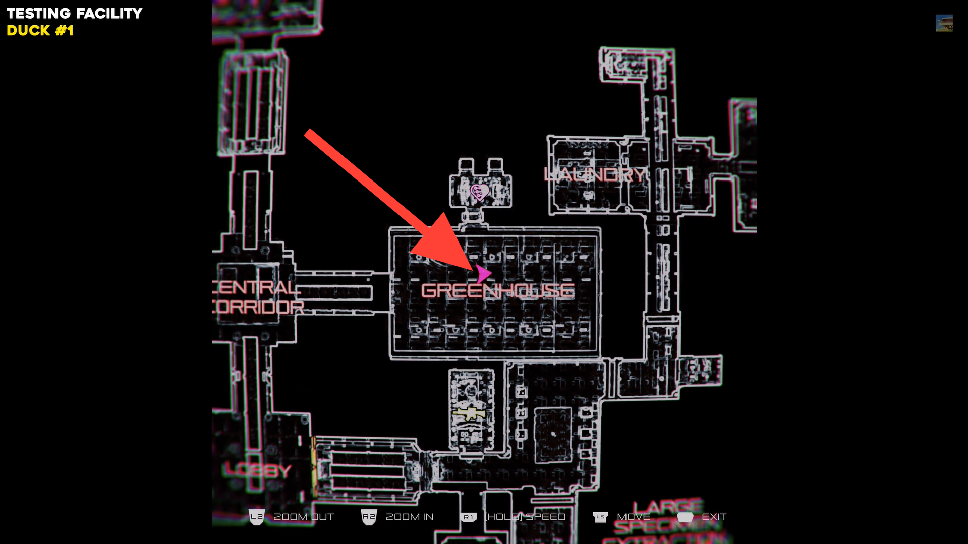 From the Central Corridor, enter the Greenhouse in the Testing Facility and head toward the apple trees on the left. Check the last tree in the northeast corner, the duck is hanging from one of the fruit plants. Interact with it to collect Duck #1.