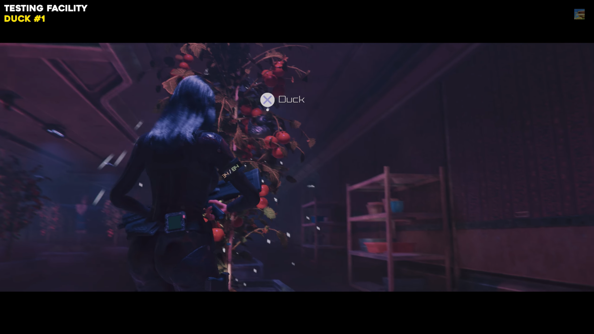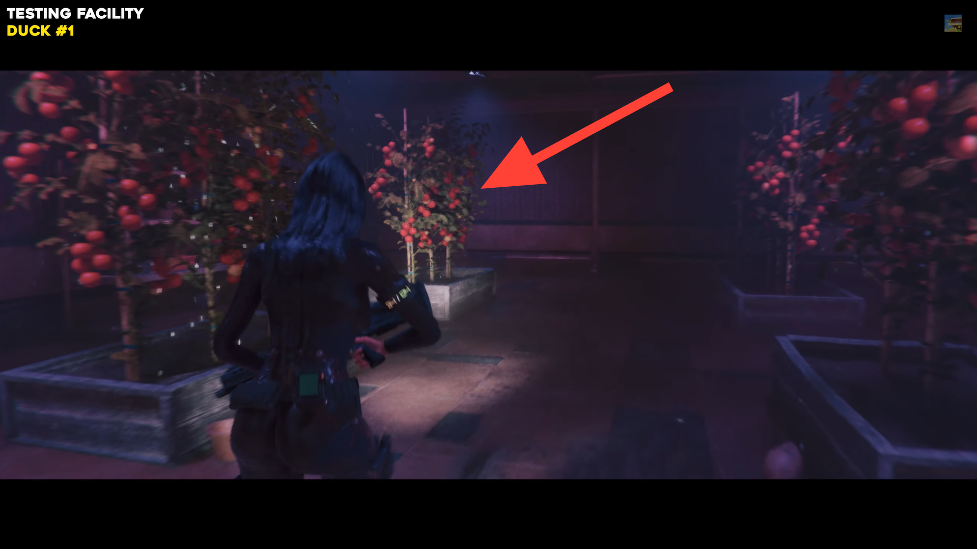 From the Central Corridor, enter the Greenhouse in the Testing Facility and head toward the apple trees on the left. Check the last tree in the northeast corner, the duck is hanging from one of the fruit plants. Interact with it to collect Duck #1.