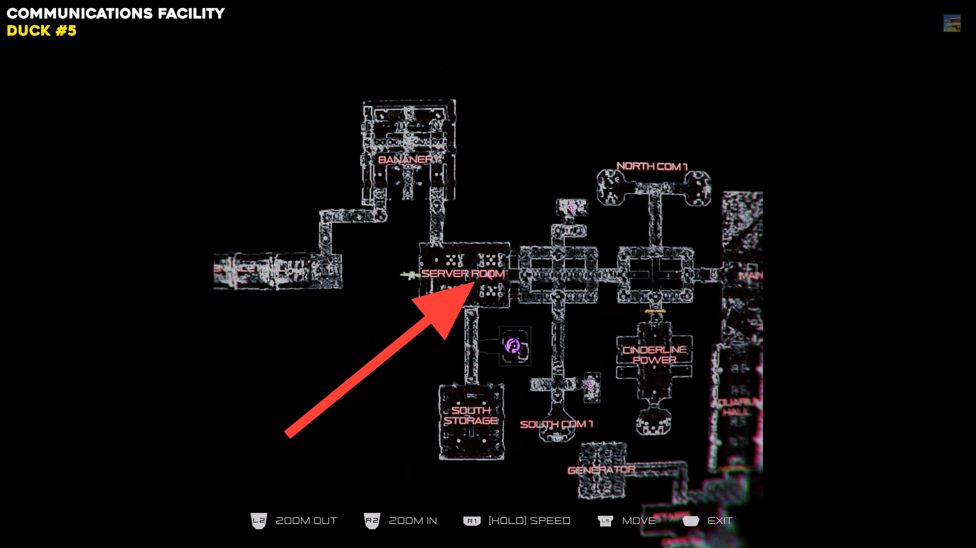 In the Communications Facility, go to the Server Room and head to the northwest corner with three clustered server units. The duck is nestled between them, approach and interact to collect it.