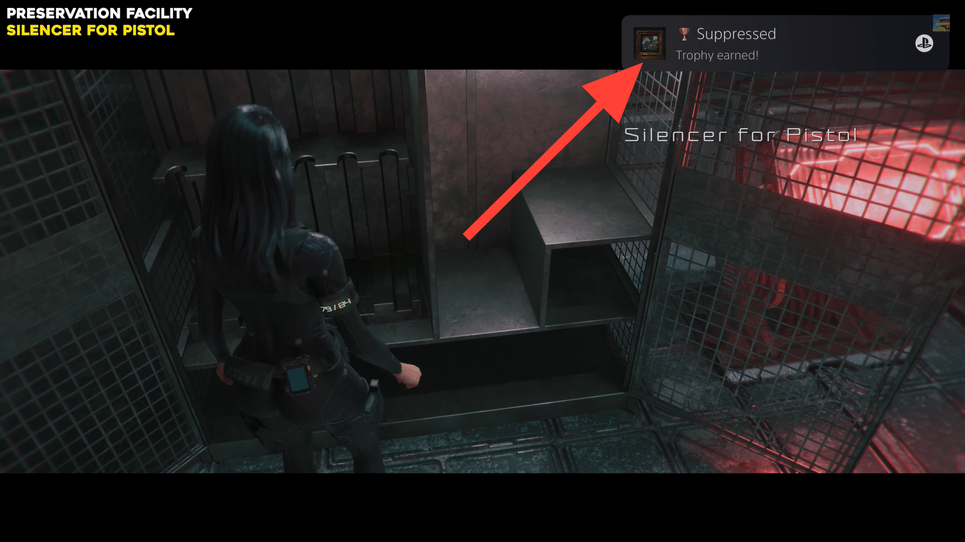 Inside the cupboard, grab the Pistol Silencer and some extra pistol ammo.​ This unlocks the “Suppressed” trophy once you equip it.​