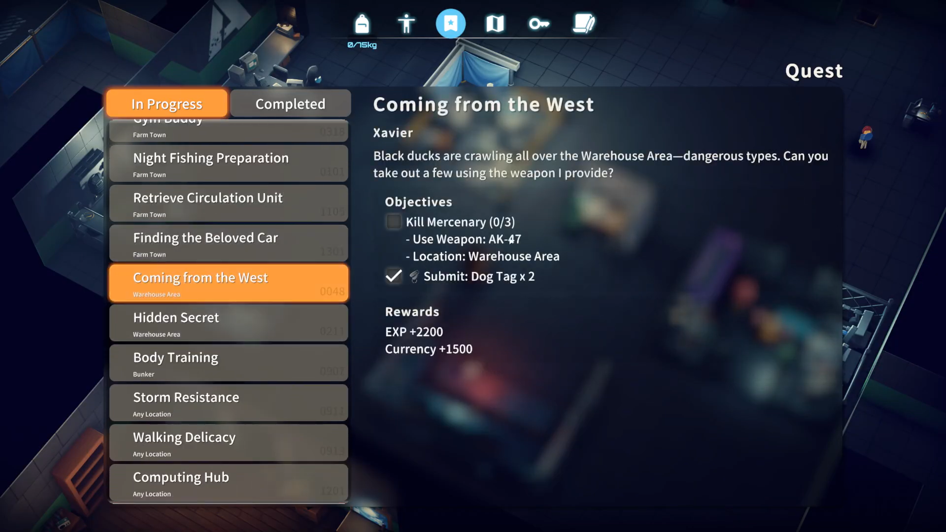 Coming from the West quest is given by Xavier in the Warehouse Area. You’ll be tasked with eliminating mercenaries using a specific weapon and collecting dog tags for rewards of XP and currency.