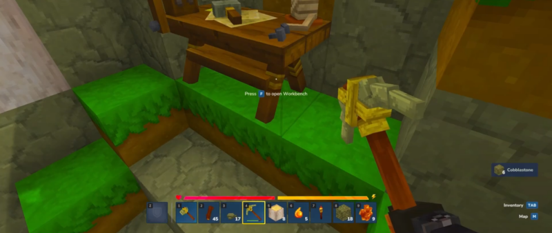- Workbench: crafting recipes, station progression, and early tool creation.