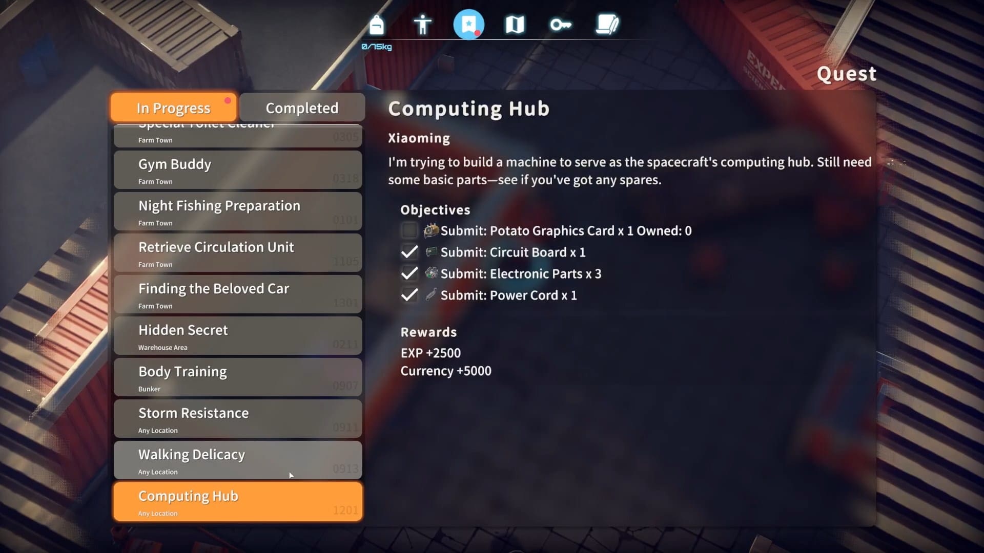 Submit each required component through the quest menu. Once all parts are delivered, the quest completes automatically.