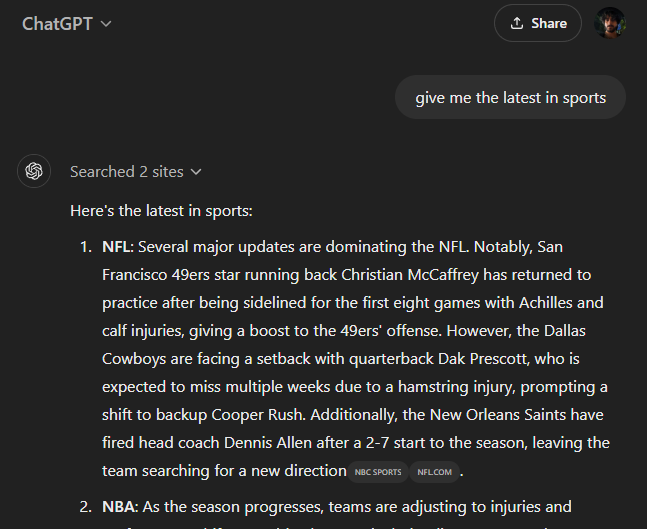 • You can get ChatGPT to provide you real-time updates and search results using ChatGPT search, which is a paid feature.