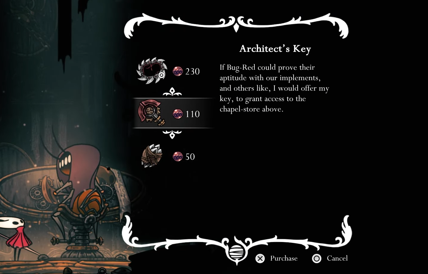 Once you've spent enough (around 50-70 Rosaries total on these), the Architect's Key appears in her inventory for 110 Rosaries. It's a steep price, but think of it as an investment in your arsenal.