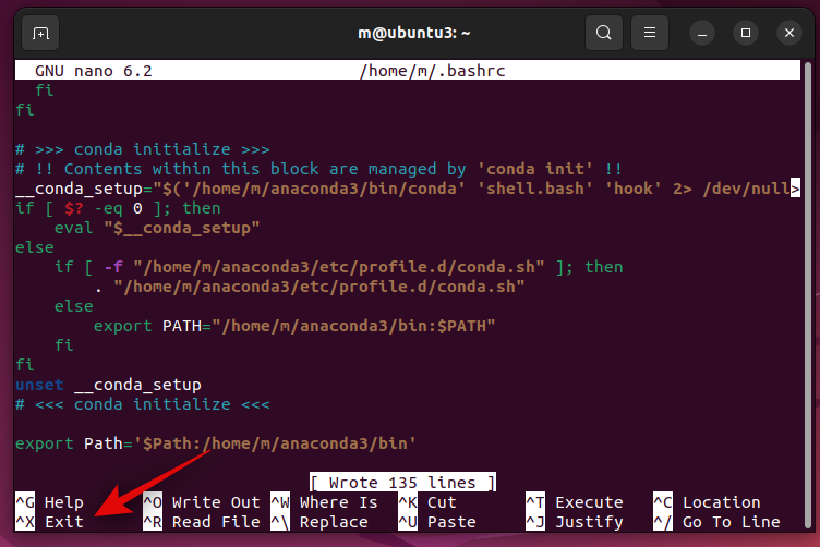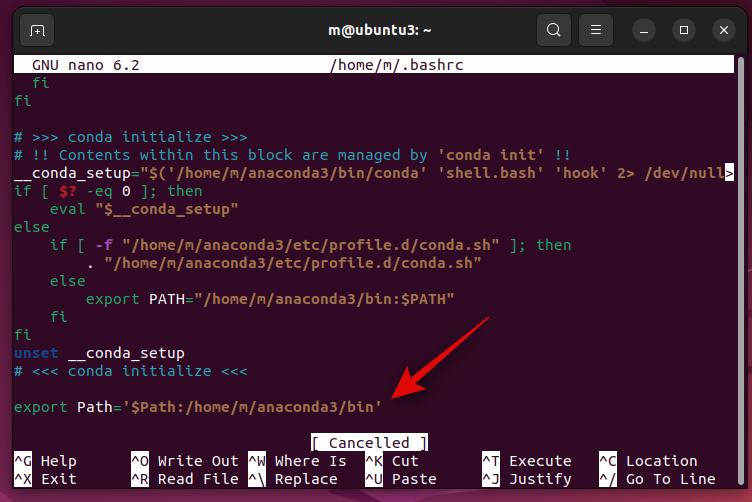 Now use the following command to add Anaconda to path variables. Replace [Path] with the location where you installed Anaconda. If you installed it in the same location, you can use this path “/home/[username]/anaconda3″. Ensure you replace [username] with your username on your PC.