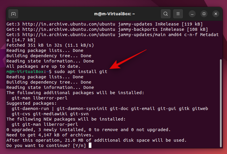 In some cases, Git might already be installed on your Linux PC. Launch the Terminal by pressing Ctrl + Alt + T on Ubuntu and use the following command to check if Git is installed.