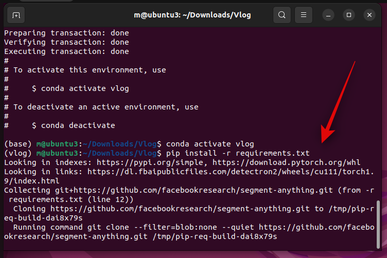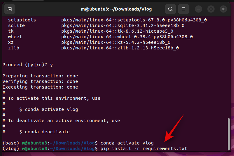 Once activated, you will see (base) in the next line. You should still be in the Vlog directory. Now use this command to create a new environment.