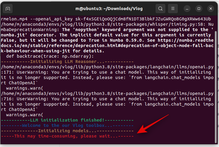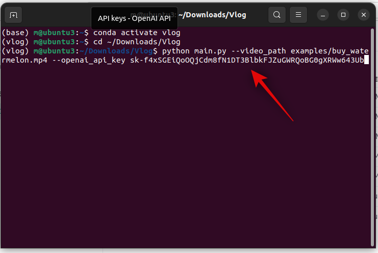 Now type in the following. Replace [Key] with the OpenAI key we generated earlier and [Path] with the path to the video you wish to convert. Vlog comes with an example video in the examples folder, so we’ll simply use that for this example.