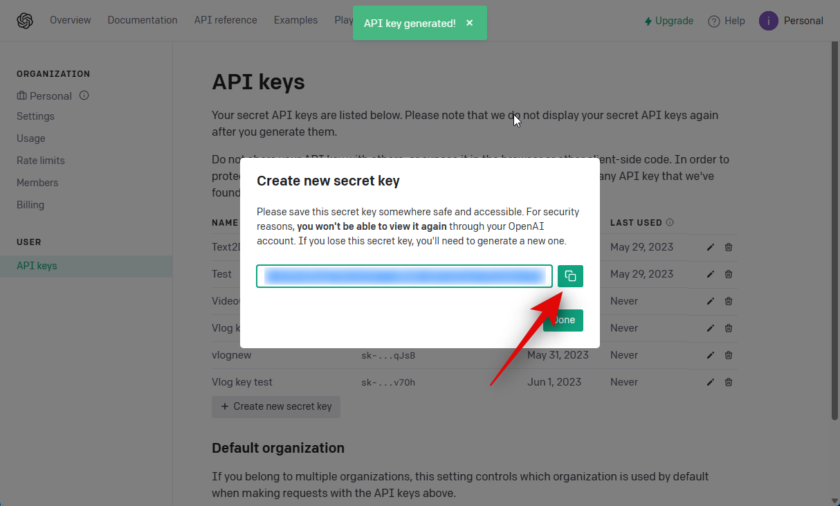 Now click the copy icon beside the key once it has been generated. Do not close the tab or the dialog box as the key won’t be visible again. Alternatively, you can note down the key in an easily accessible location.
