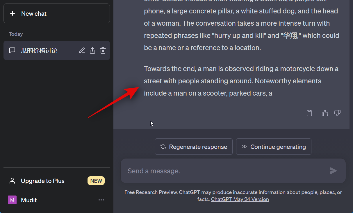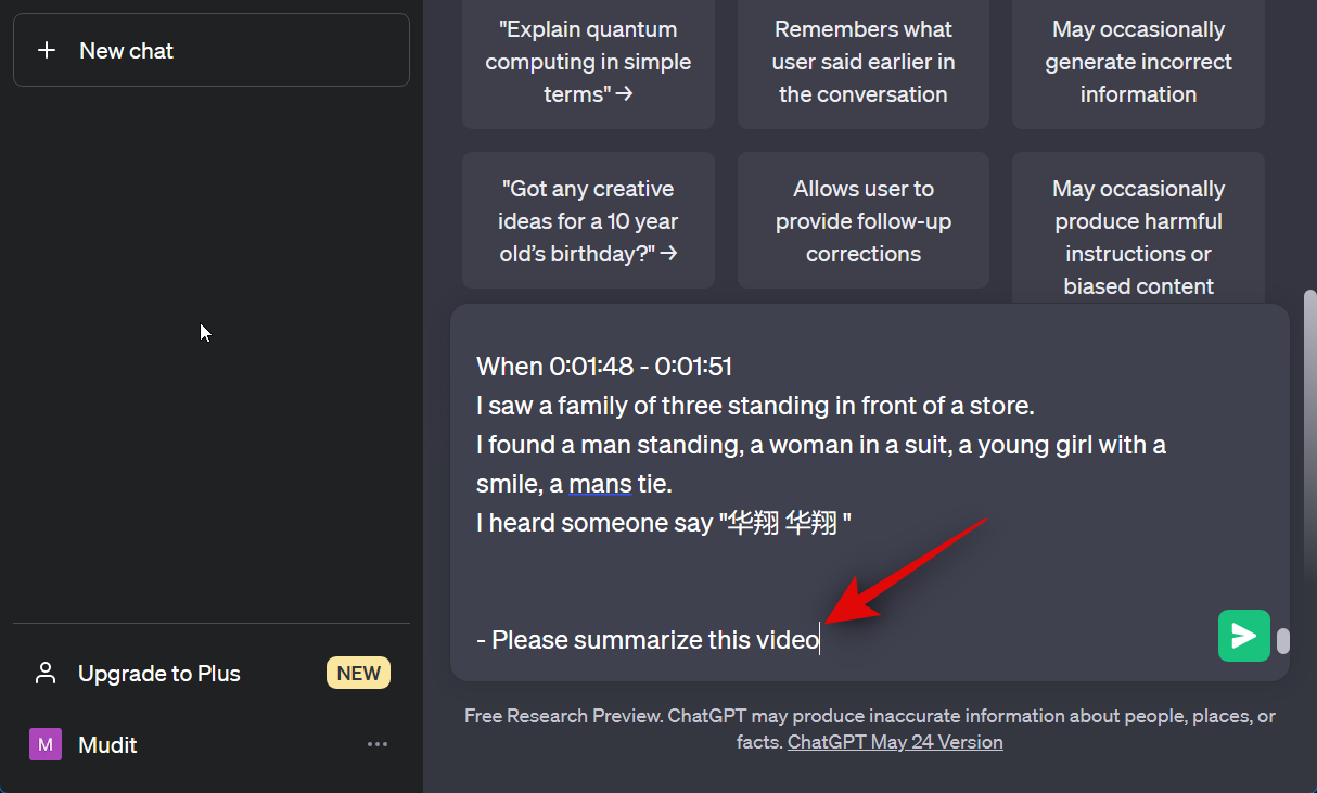 Once logged in, copy and paste the contents of the converted video document followed by your query and press Enter. Let’s ask ChatGPT to summarize the video for this example.