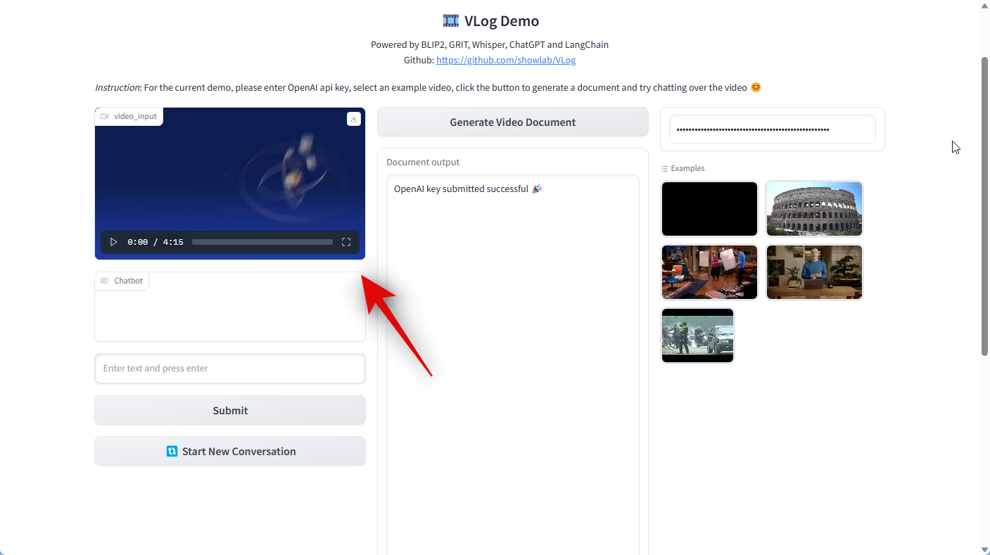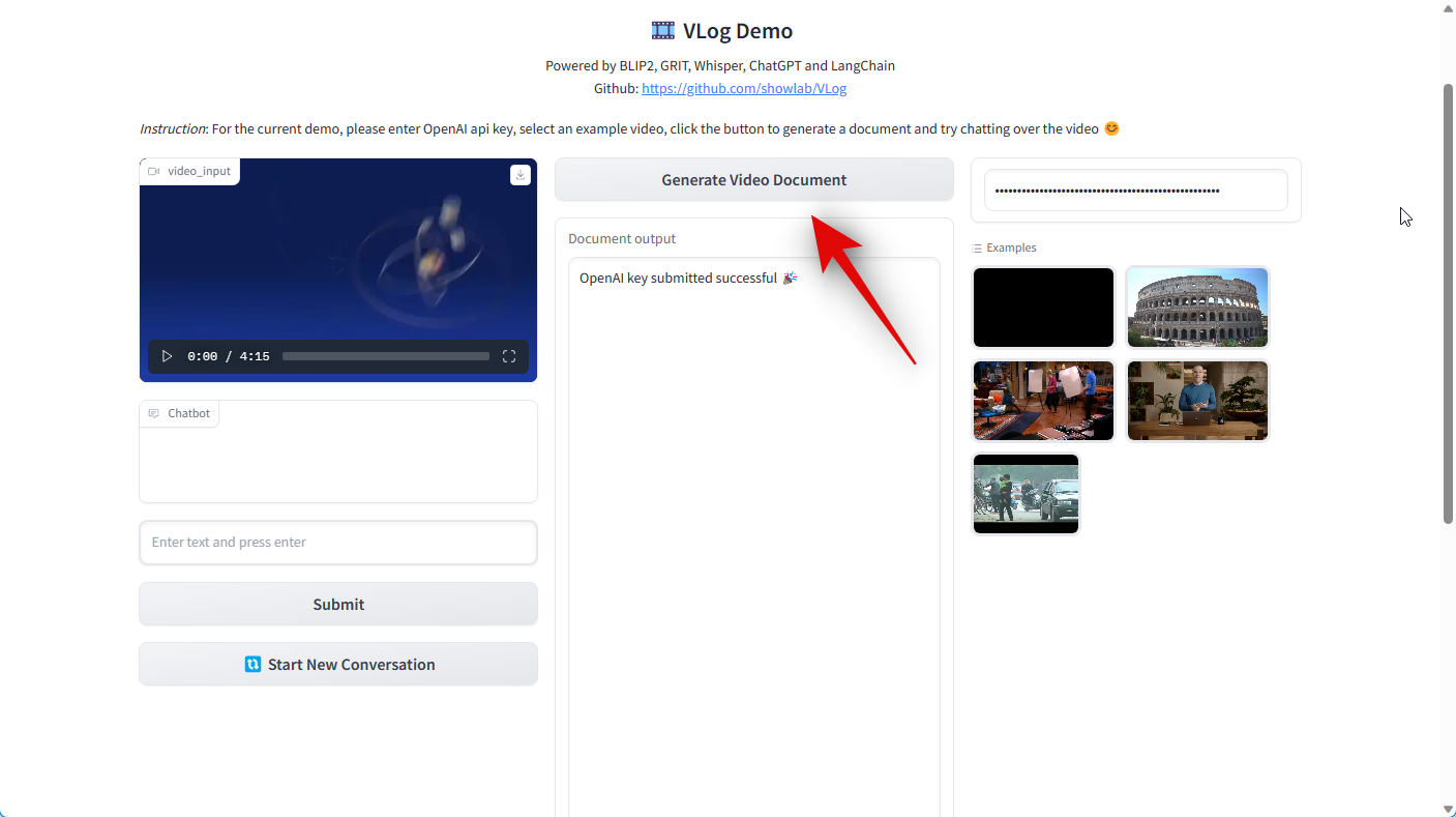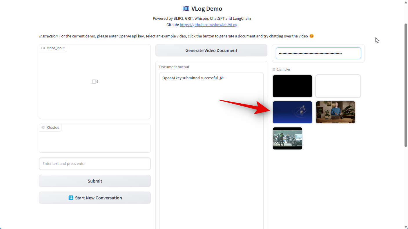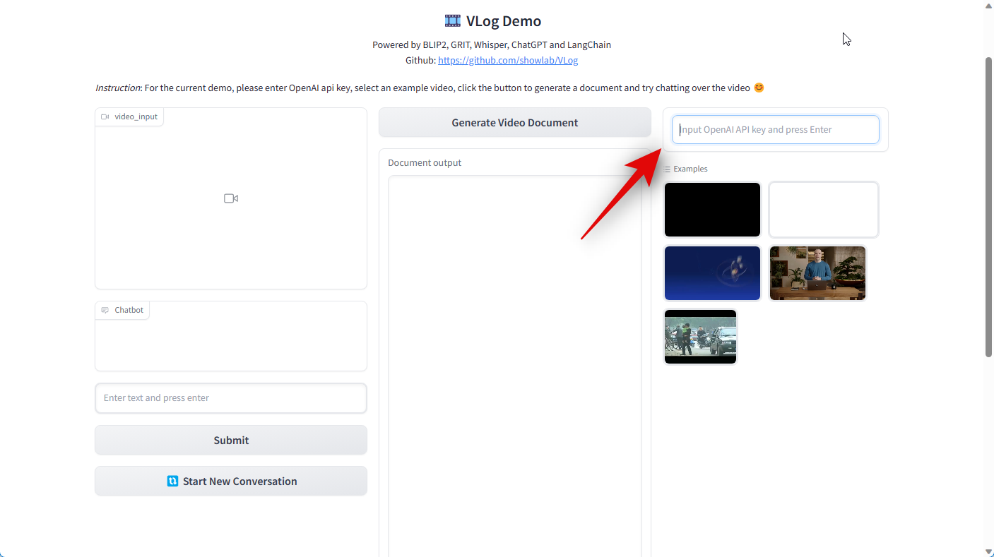 Once copied, visit huggingface.co/spaces/TencentARC/VLog in your browser. This is the HuggingFace demo for Vlog. Now paste the copied key in the top right corner in the text box titled Input OpenAI API key and press Enter.