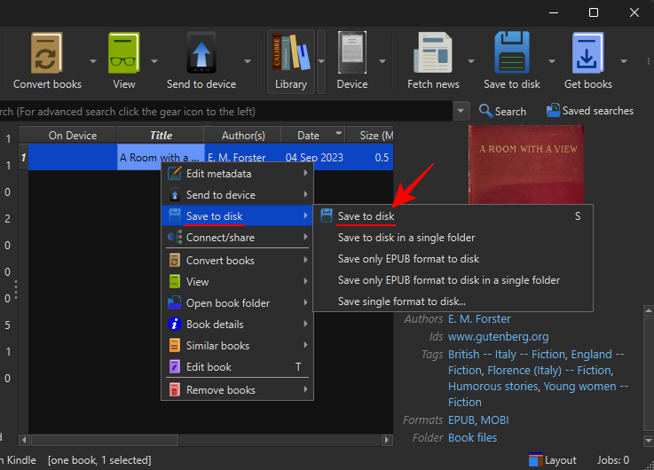 As long as they’ve been converted to the MOBI or AZW3 format, your EPUB books can be sent to your Kindle device using a USB cable. On the Calibre app, right-click on your book, hover over Save to disk, and select Save to disk again.