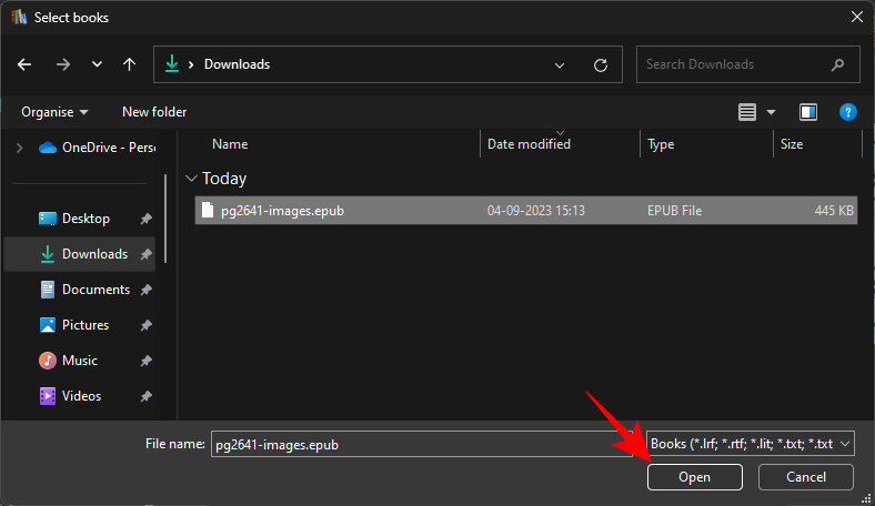 Navigate to your EPUB file, select it, and then click on Open.