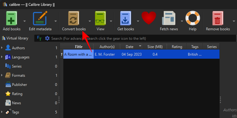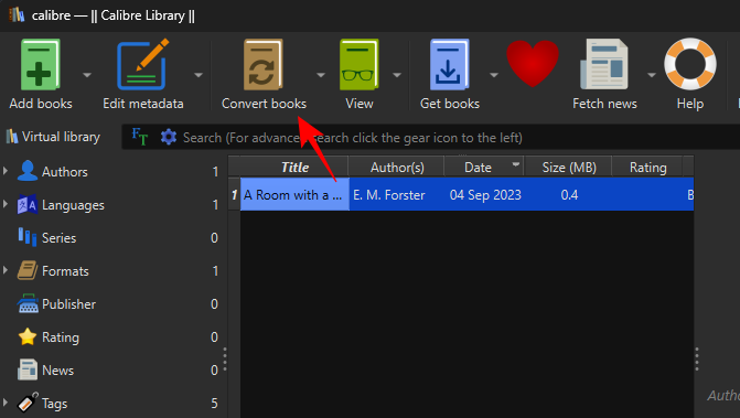 Once the EPUB file is in Calibre’s library, click on Convert books in the main toolbar at the top.