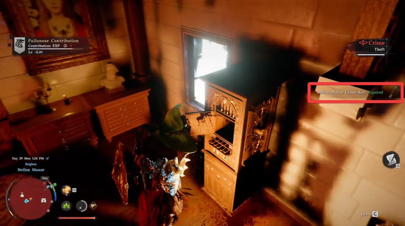 Use the key to open a locked wardrobe within the manor. Inside, you’ll find a mechanism involving a handwheel.