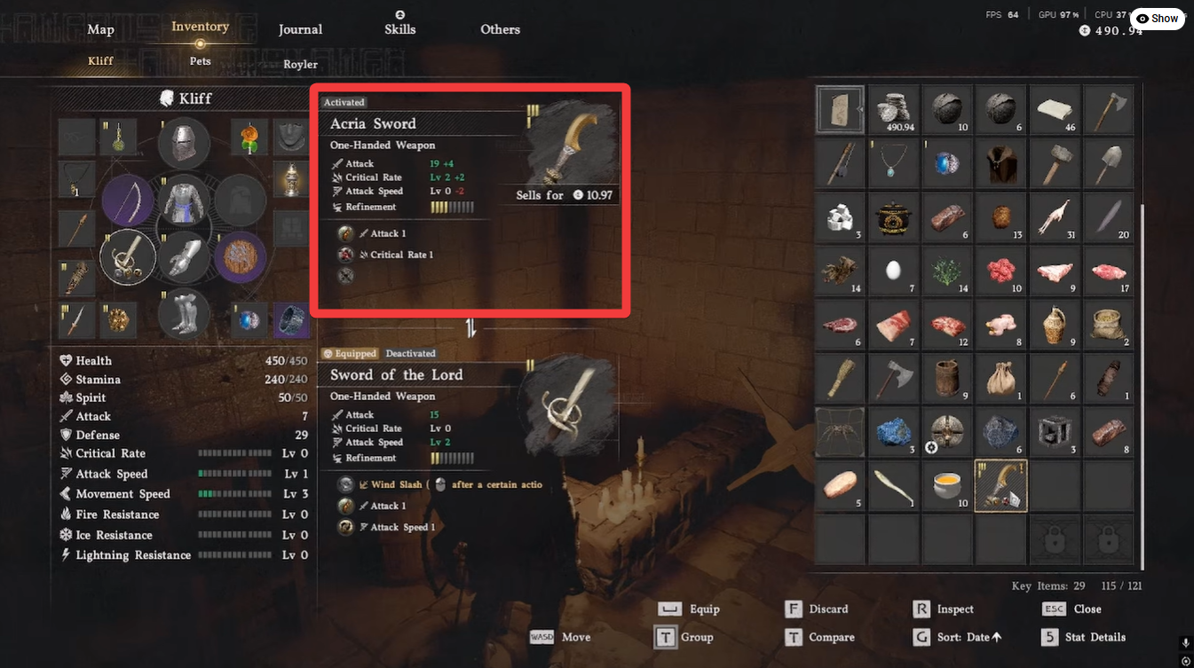 The Acria Sword immediately stands out due to its curved golden blade and ornate detailing, suggesting a ritualistic origin. When you equip it, you’ll notice that it comes pre-refined at level 4, meaning you don’t need to invest heavily in upgrades early on.