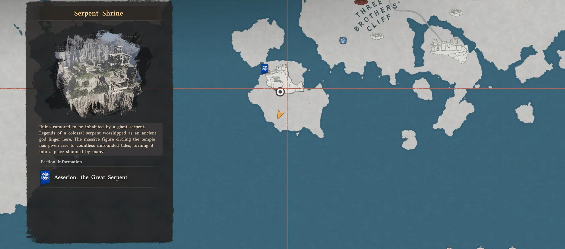 Travel to Serpent Shrine on the southwestern island. Glide down the southern cliffside to spot protruding ruins with a mural of a figure and serpent.
