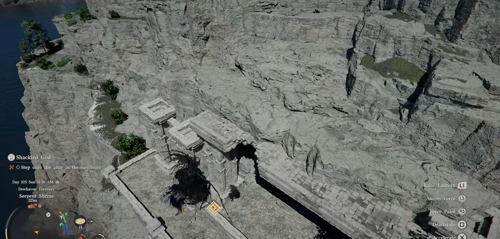 Here, scales litter the grounds and blueprint hides in cliffside ruins near murals. Your first task here is to drop down to the ruins below.