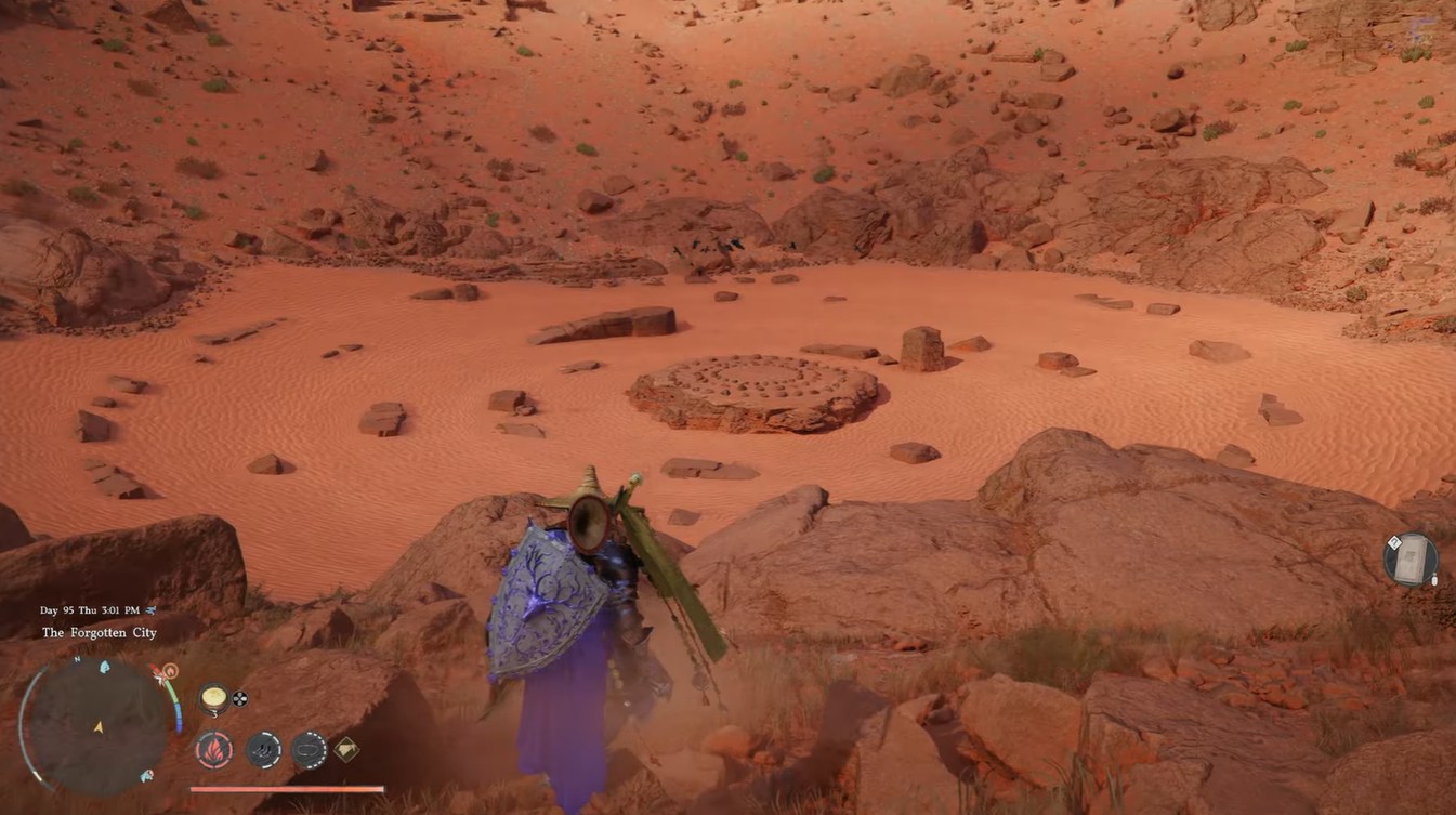 The key landmark you are looking for is a set of concentric circles formed in the quicksand. This area stands out visually, especially compared to the surrounding flat desert. The terrain here is unstable, so movement needs to be controlled and deliberate.