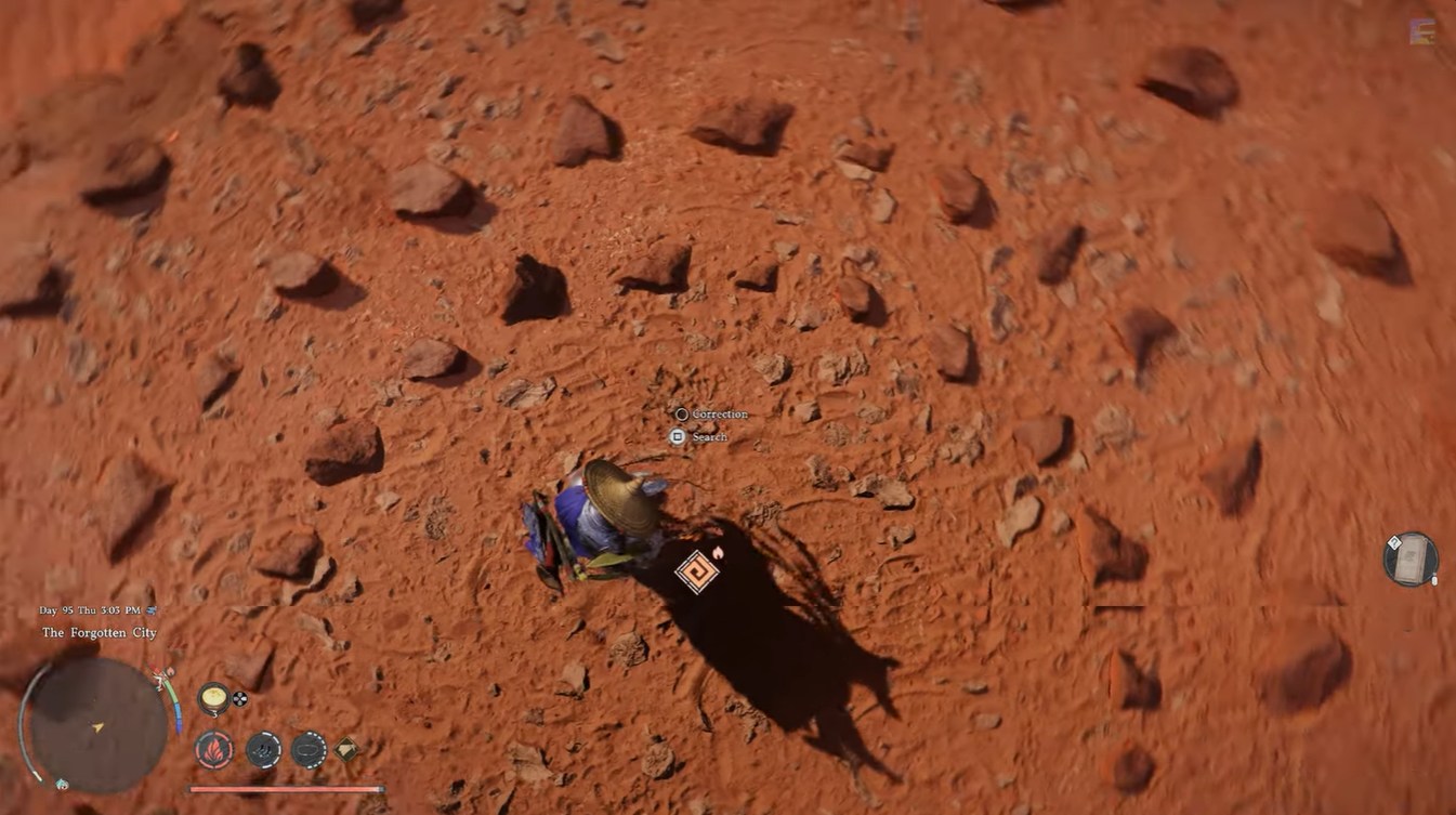Head to the desert zone above Forebearer’s Barren and identify the quicksand area. Move cautiously as the terrain can slow you down or disrupt positioning.