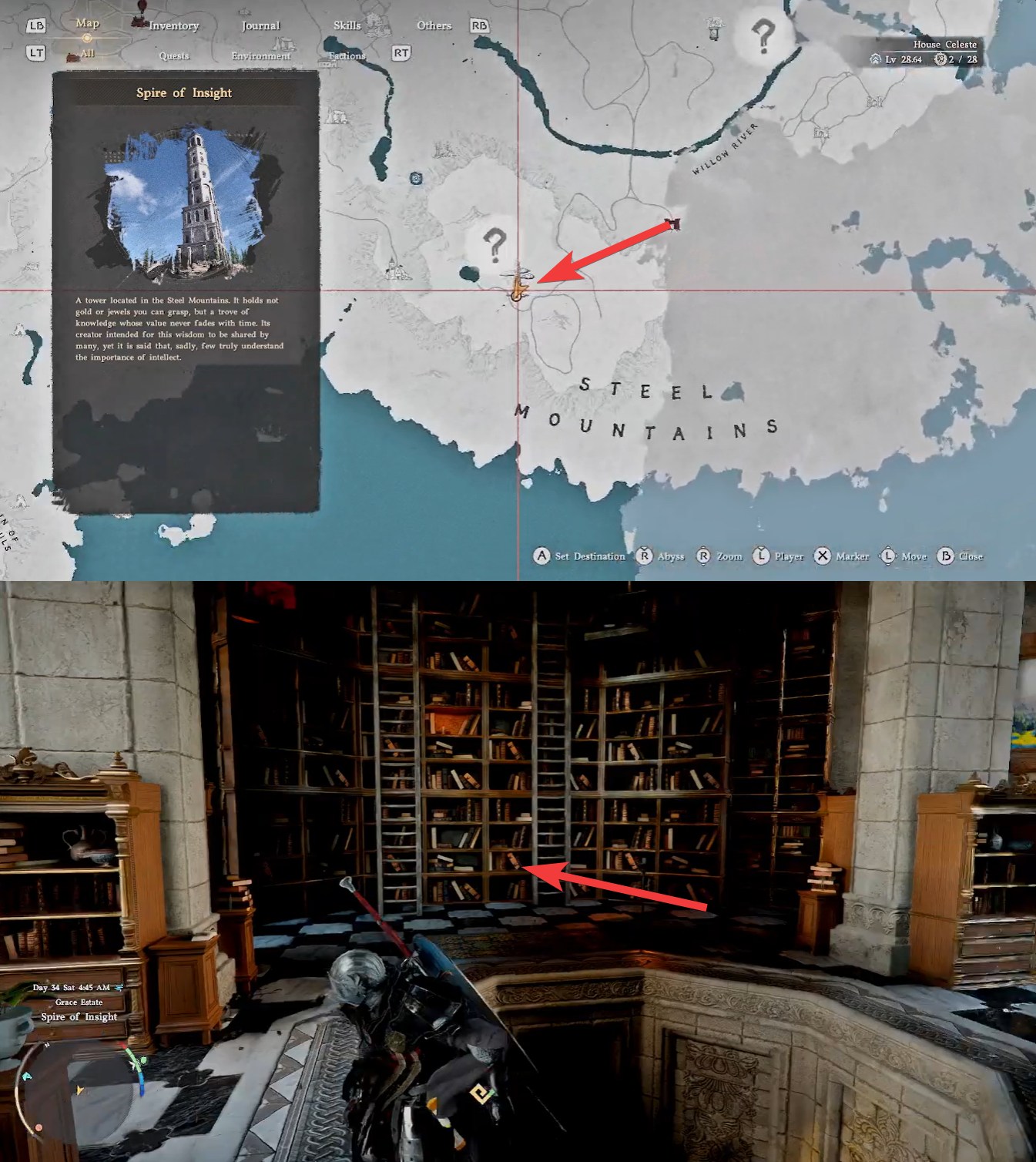 One of the most consistent ways to get the blueprint is by heading to the Steel Mountains region. When you reach the Spire of Insight, make your way up to the third floor where the library is located. From there, carefully search the lower shelves, as the book tends to be placed among other interactable objects.