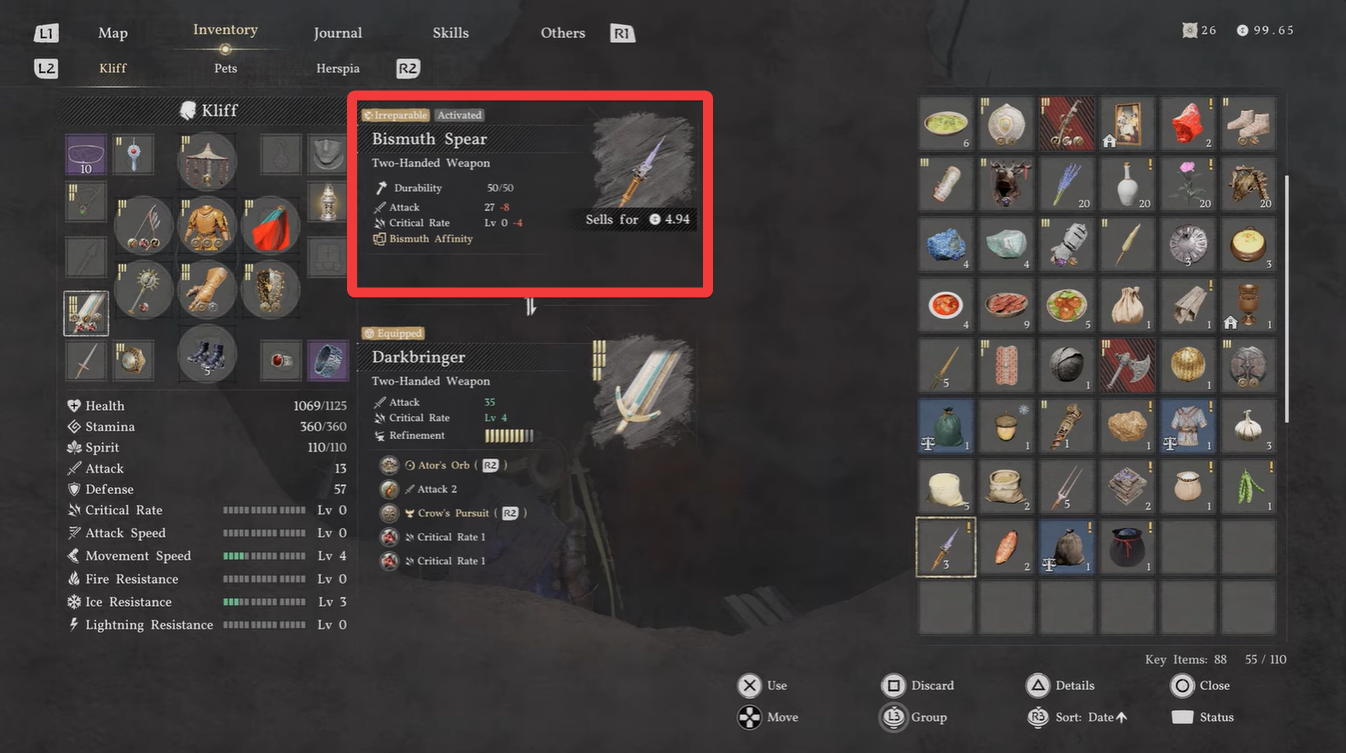 The Bismuth Spear offers a balanced stat profile that makes it particularly useful during mid-game exploration. Its attack range of 27–28 provides decent damage output without requiring upgrades right away.