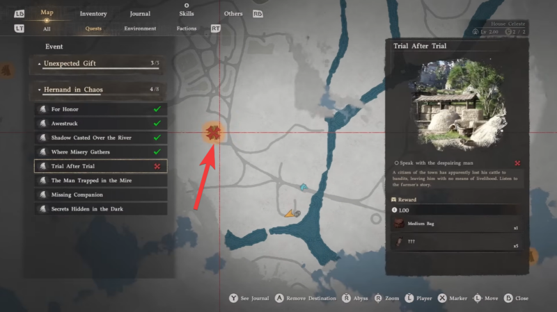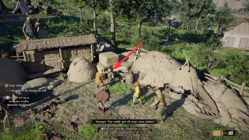 During the “Trial After Trial” quest, Bremer is no longer found at his usual outdoor location. Instead, you will find him inside the Hernand Farmhouse, where he appears distressed after losing his cattle.