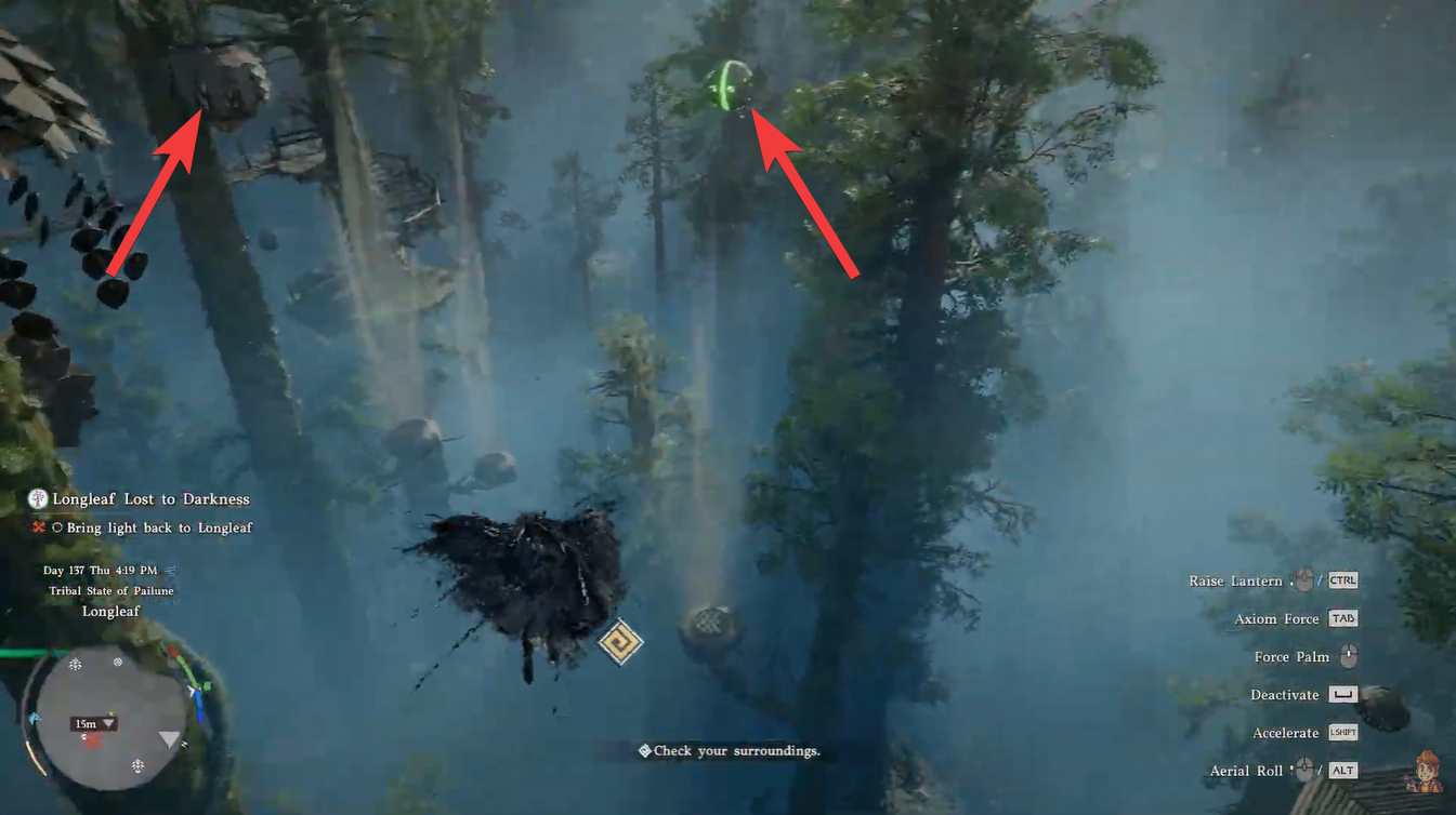 When you reach the marked location in Longleaf, you’ll notice a dense forest environment with multiple vertical layers. The design intentionally pushes you upward, encouraging exploration above ground level rather than across it.