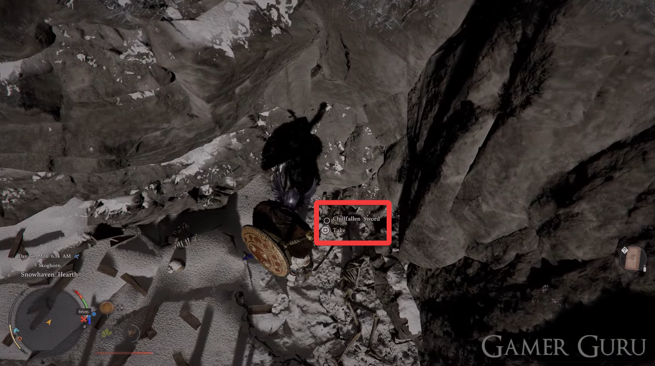Interact with the sword lying beside the skeleton to pick up the Chillfallen Sword. It’s a straightforward pickup with no restrictions.